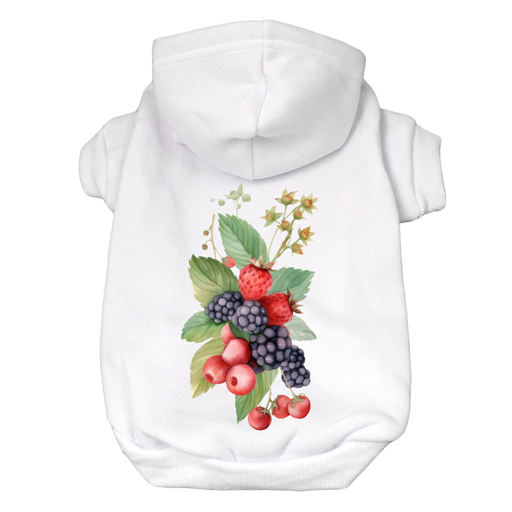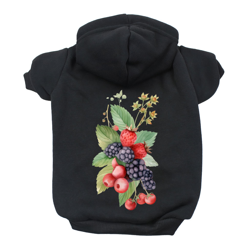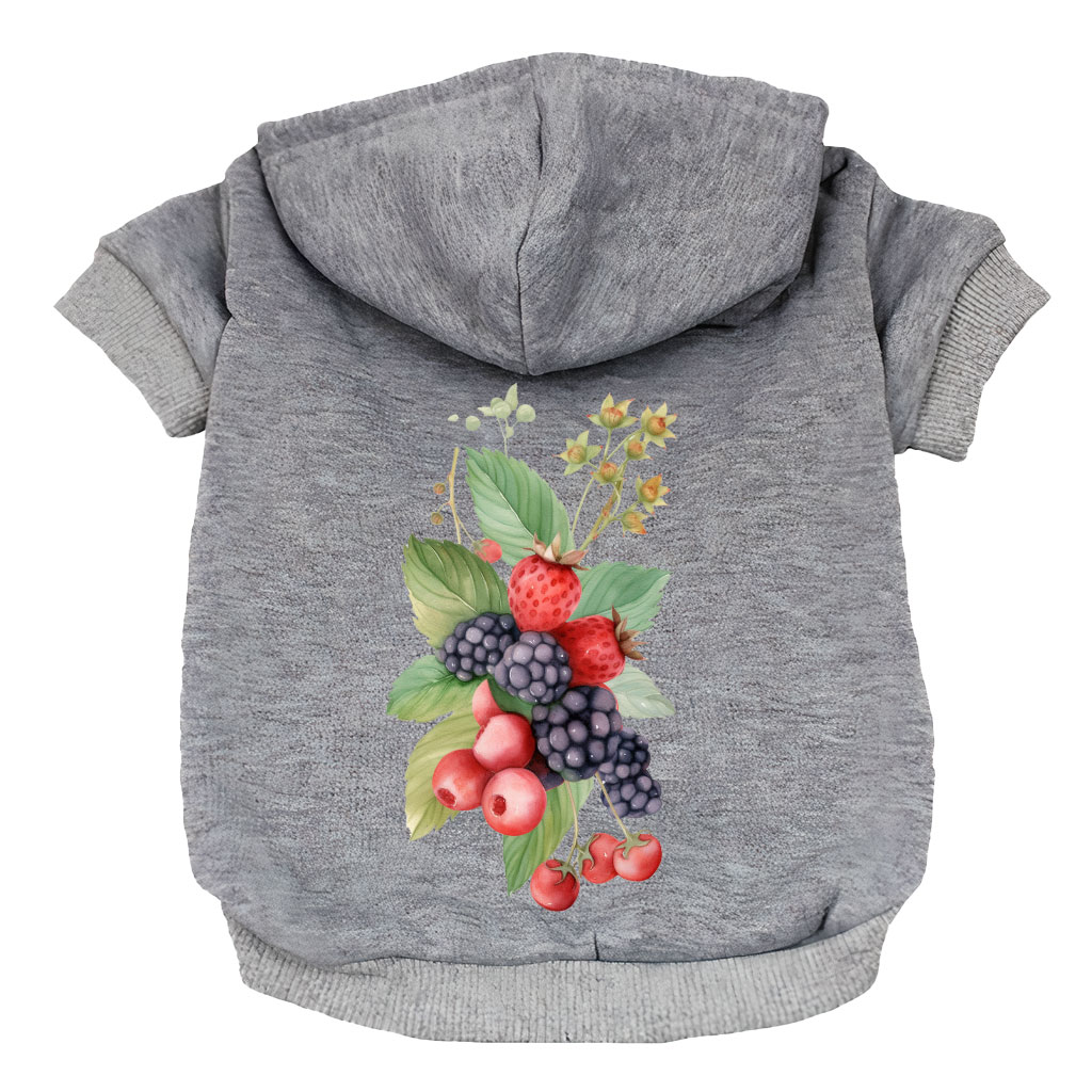 Comfortable, breathable coat to keep your dog warm in cold weather. Berries Print Dog Hoodie is designed for winter or autumn weather, it has ribbed sleeves and hem for a comfy fit.