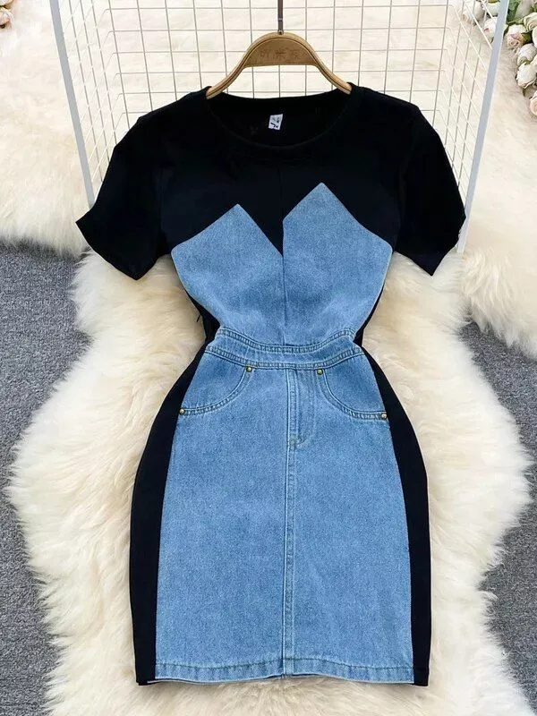 Embrace the seamless blend of casual sophistication and contemporary fashion with our Chic Denim Splice A-Line Dress. Perfectly suited for the modern woman, this dress is a staple for any season, offering versatility and style in one. The simplicity of the design, complemented by the innovative denim splice, creates an illusion of a two-piece ensemble that will keep heads turning whether you’re at a brunch or an office event. Its round neck and short sleeve combo present a flawless canvas for accessorizing or keeping it stunningly minimalist.