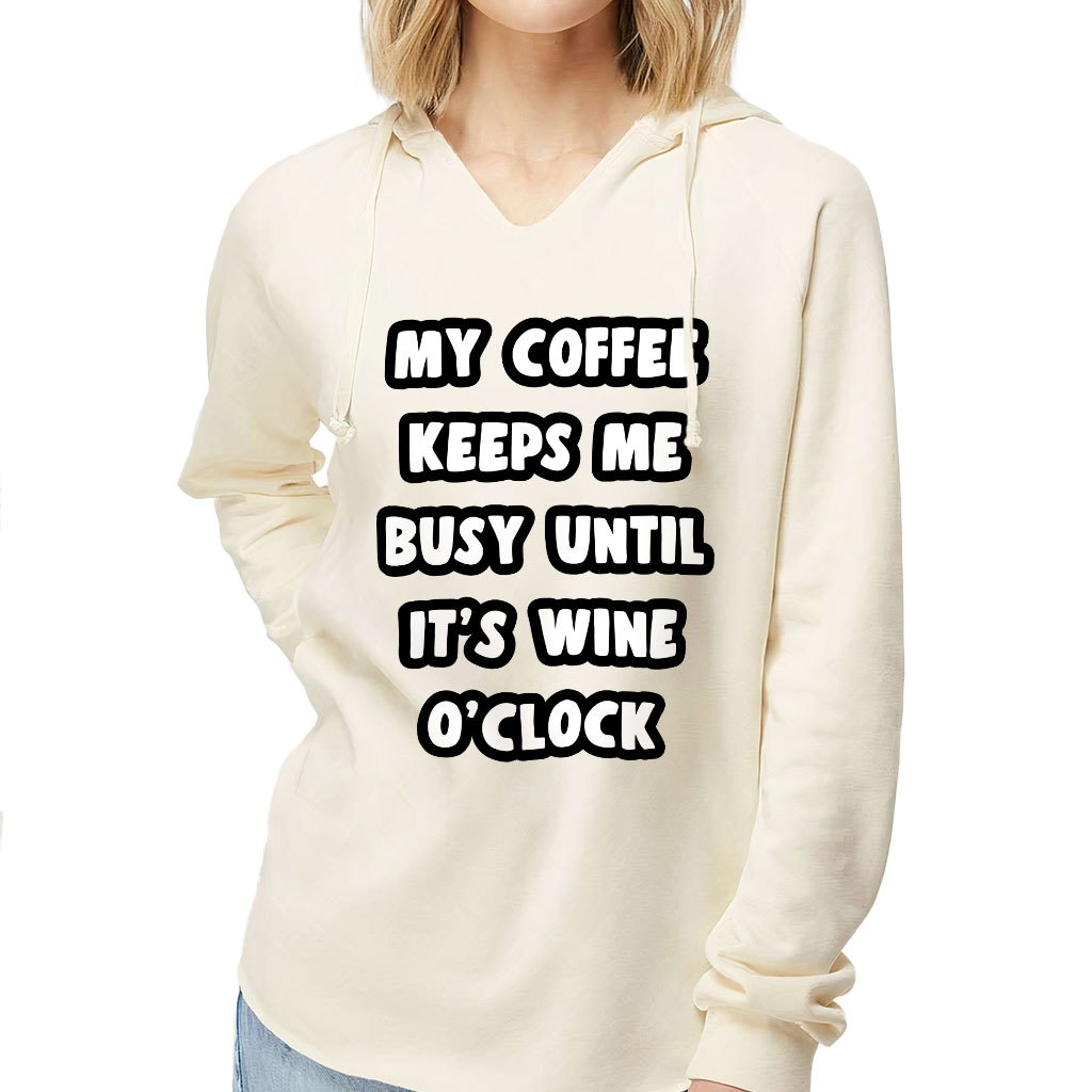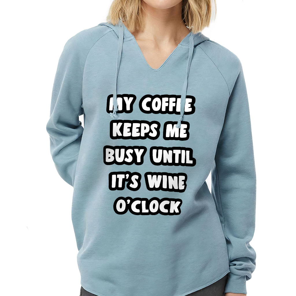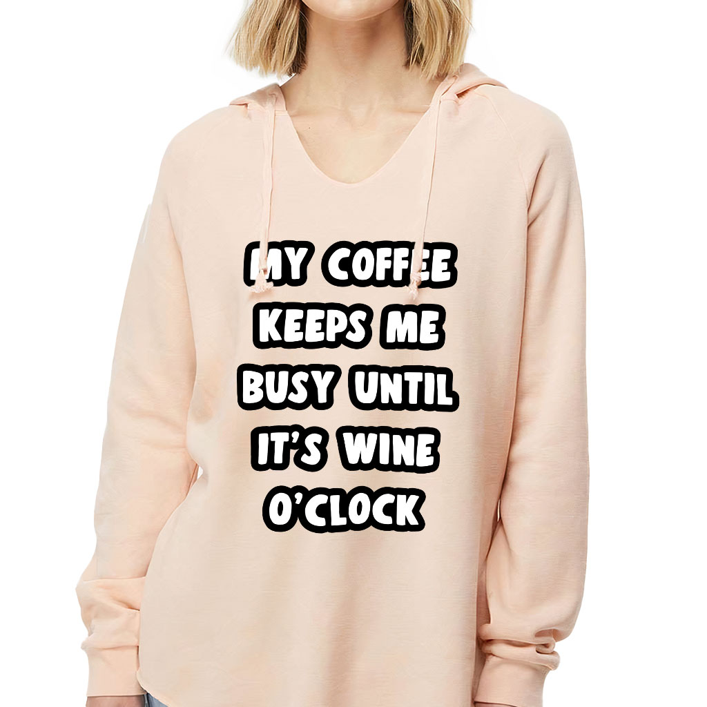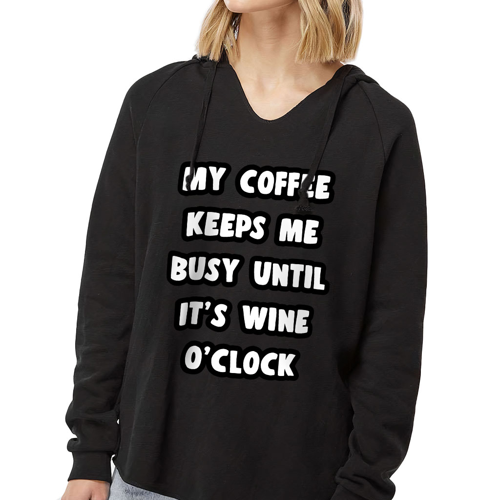Cotton blend fabric is super soft and comfortable to wear. Coffee Until Wine California Wave Wash Hoodie is light and airy with soft-to-the-touch fabric, made of cotton and polyester. It is also skin-friendly, very stretchy and comfortable, that feels as good as it looks.