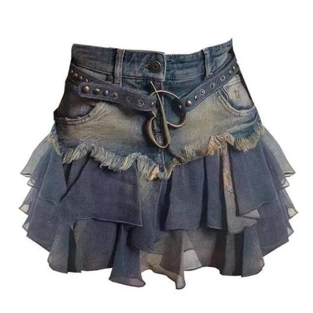 Y2K Ruffle Denim Mini Skirt | Cute A-line Jean Skirt with Elastic Waist