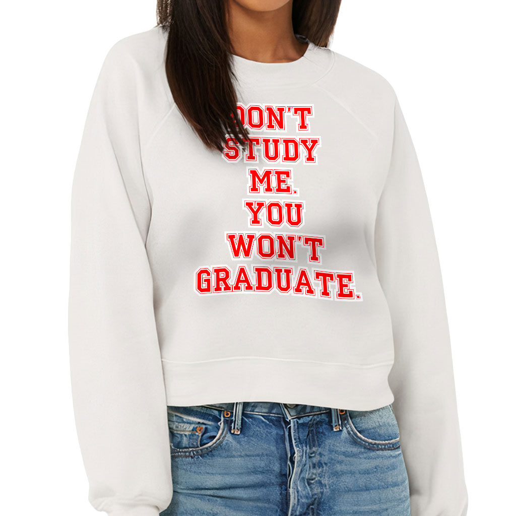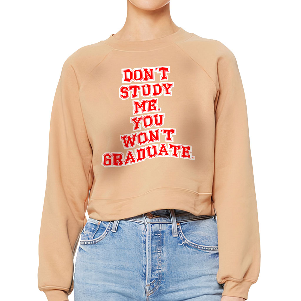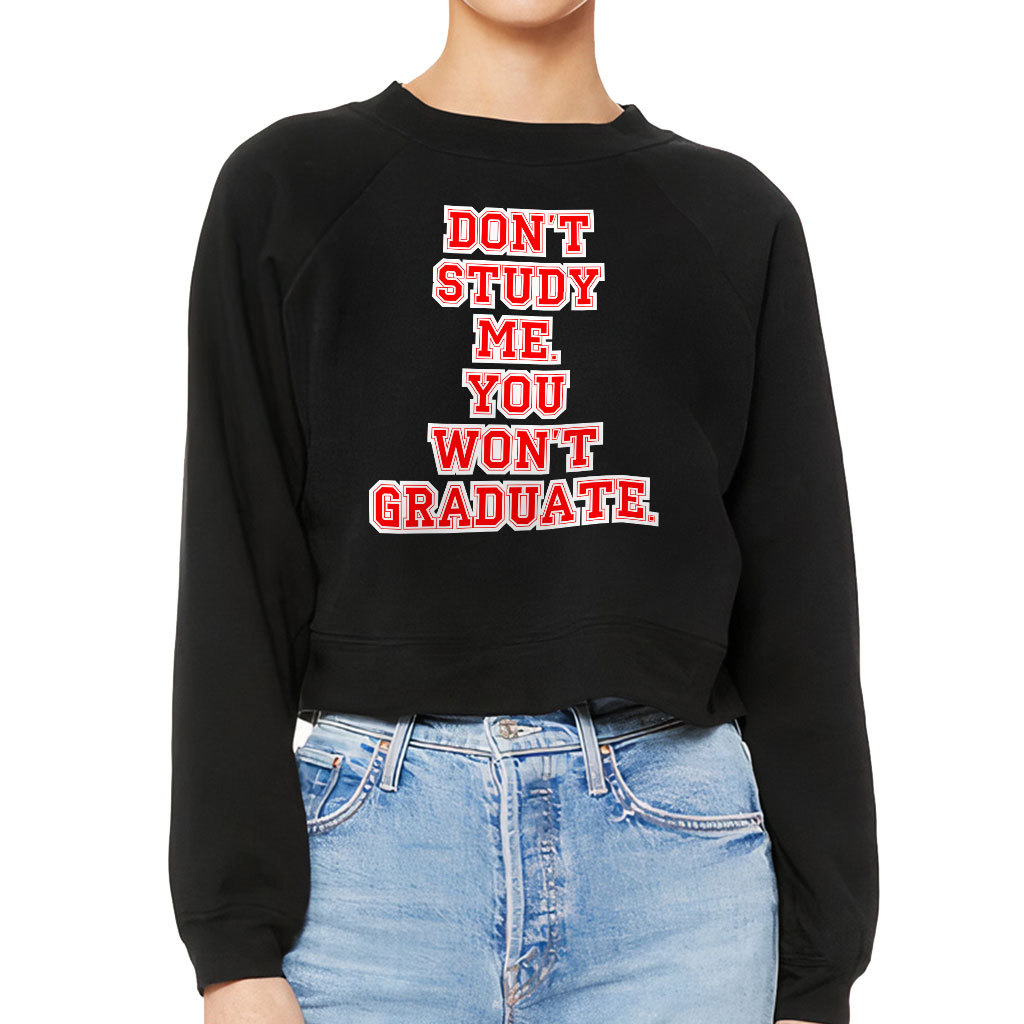 Don’t Study Me You Won’t Graduate Raglan Pullover Looking for some cozy comfort? Funny Quote Women’s Sweatshirt is just what you need! With contoured seaming on the raglan sleeves, it’s perfect for those lazy days, but stylish enough for heading out and about. This mid-length classic, made with our favorite sponge…