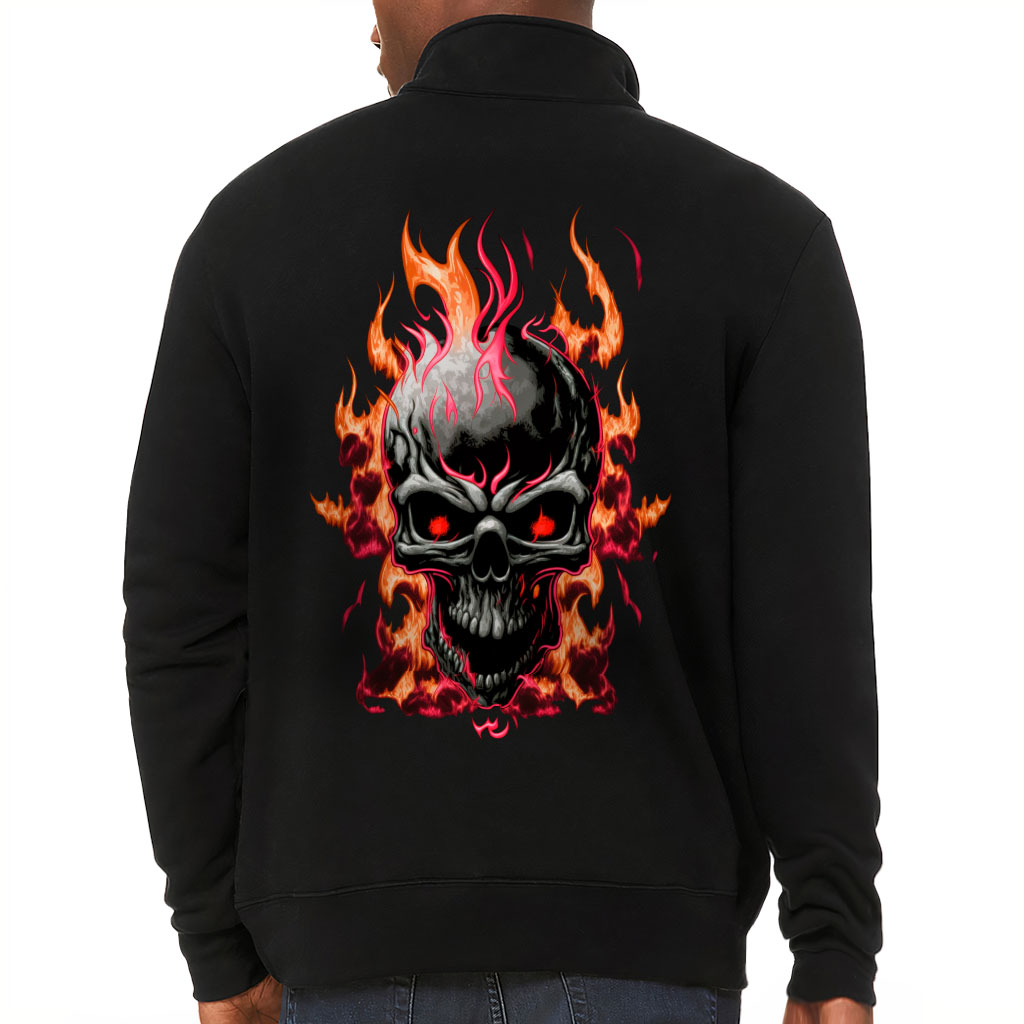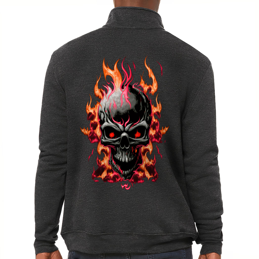 Flame Skull Zip Pullover is comfortable and cool! This incredibly soft fleece pullover combines a sophisticated quarter zip, set-in sleeves and hidden side pockets.
