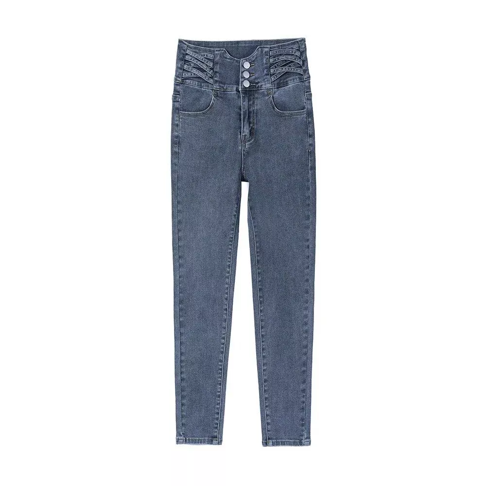 Every pair of these carefully designed jeans is crafted with quality cotton elastic denim, ensuring a snug yet flexible fit that moves with you. The full-length cut and pencil pant design create a sleek silhouette, while the light wash gives them a timeless appeal. The added decoration of a belt and button provides an extra touch of high street fashion, ensuring you look as good as you feel.
