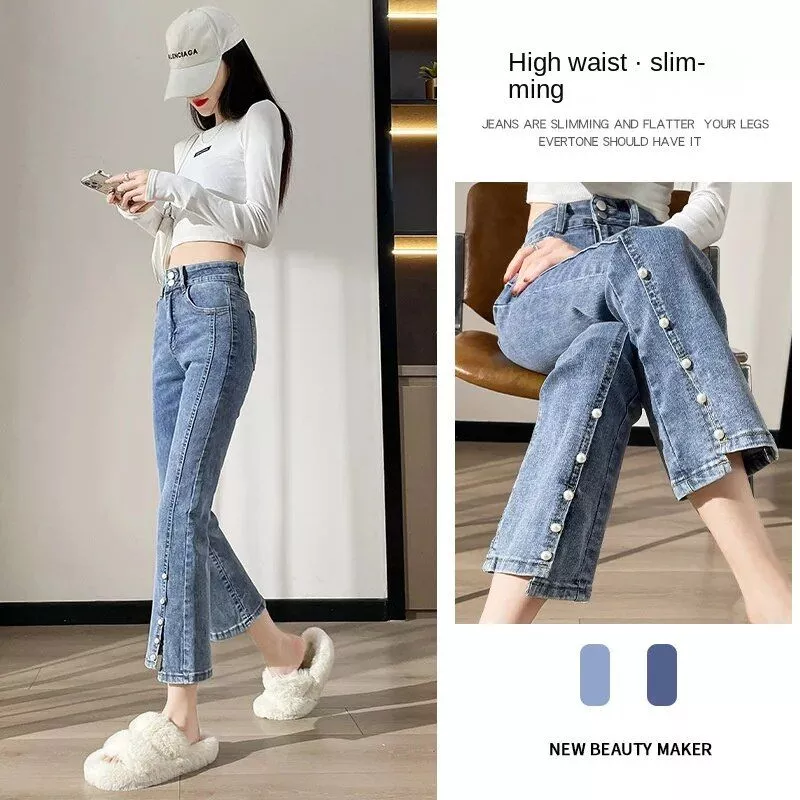 What makes these jeans special is their perfect blend of trend-setting features and classic elements. The ankle-length cut makes them ideal for the warmer months, while the high waist and flare design celebrate the timeless beauty of vintage fashion. The unique pearl decoration sets these jeans apart from the ordinary, making them an enviable addition to any fashion-savvy wardrobe.