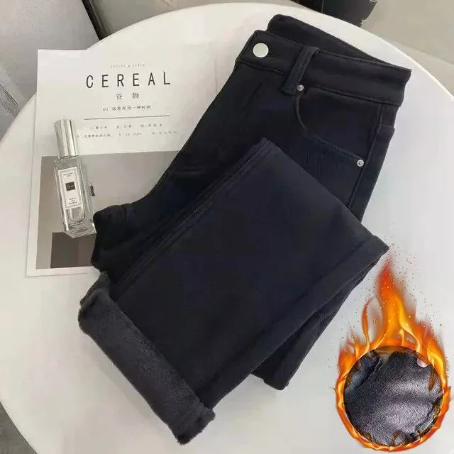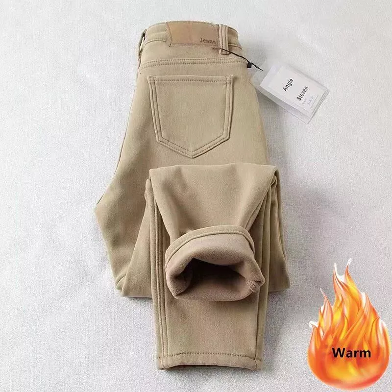 Aside from their insulating velvet lining and sophisticated high-waist design, these jeans are crafted to provide a comfortable, yet flattering fit. The meticulous construction and attention to detail ensure they maintain their shape wear after wear, making them a lasting addition to your winter wardrobe.