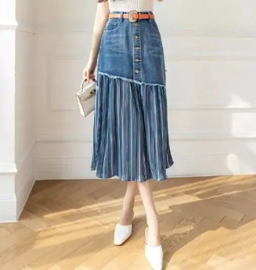 The beauty of this skirt lies in its unique patchwork pattern and meticulously pleated denim, which combine to create a look that’s both sophisticated and casual. Whether you’re meeting friends for brunch or heading out for a day in the city, this skirt’s mid-calf length and slim-fit silhouette provide a flattering shape for all body types, from S to 5XL. Plus, the slight stretch in the fabric offers comfort without compromising on style.
