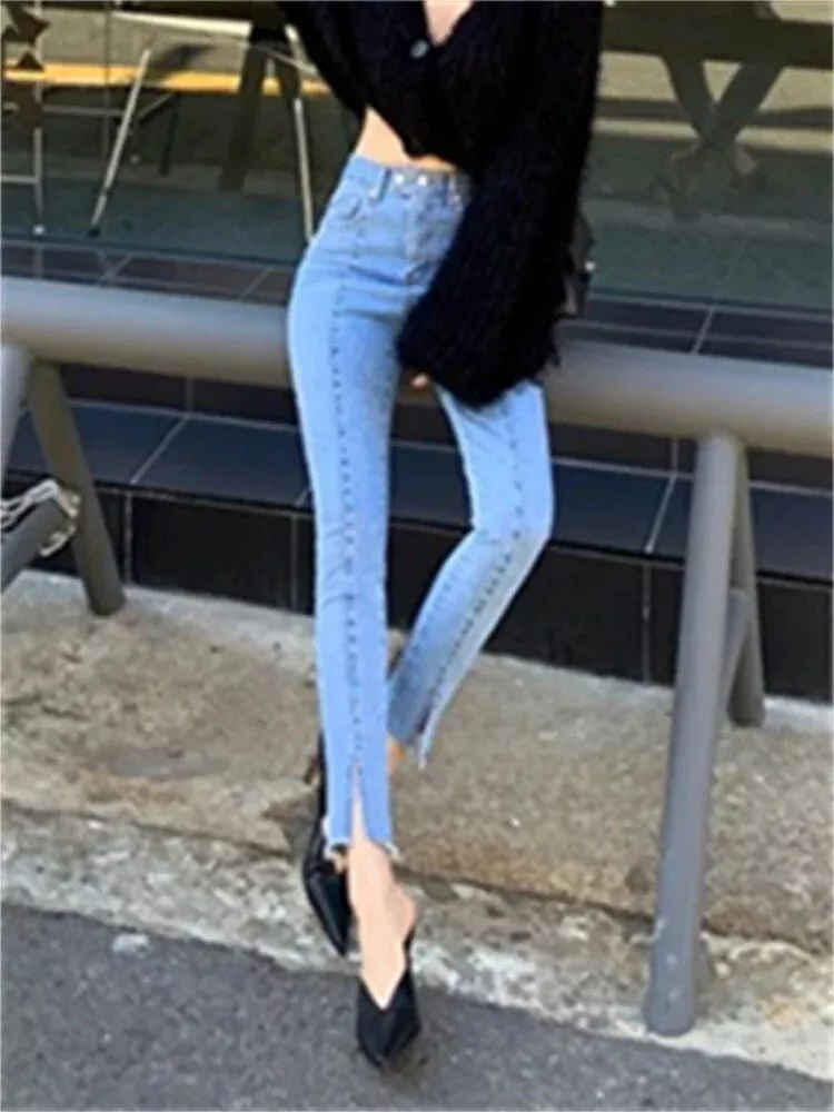 Our jeans are more than just a piece of clothing; they’re a canvas of expression. The high-waisted design provides a flattering fit that accentuates your silhouette, while the innovative spliced and split zipper details inject a dose of edgy Korean fashion into your ensemble. The smart use of fake zippers and patchwork adds texture and intrigue without compromising on sophistication.