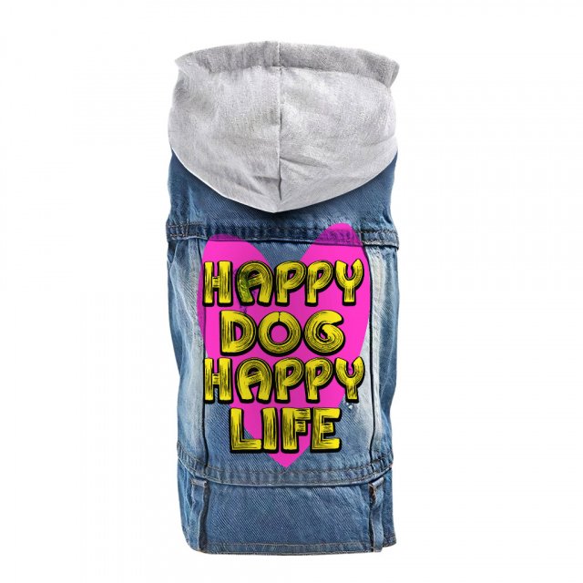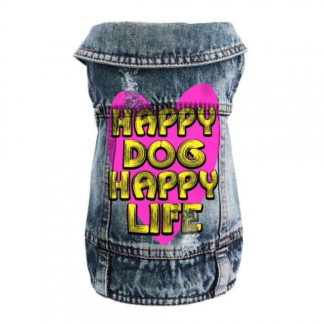 Happy Dog Happy Life Dog Denim Jacket – Phrase Dog Denim Coat – Art Print Dog Clothing