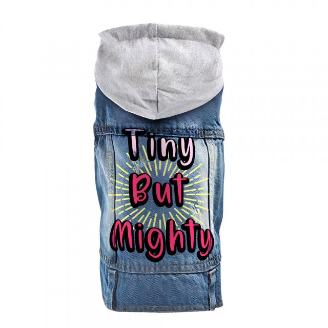 Tiny but Mighty Dog Denim Jacket – Art Dog Denim Coat – Word Art Dog Clothing