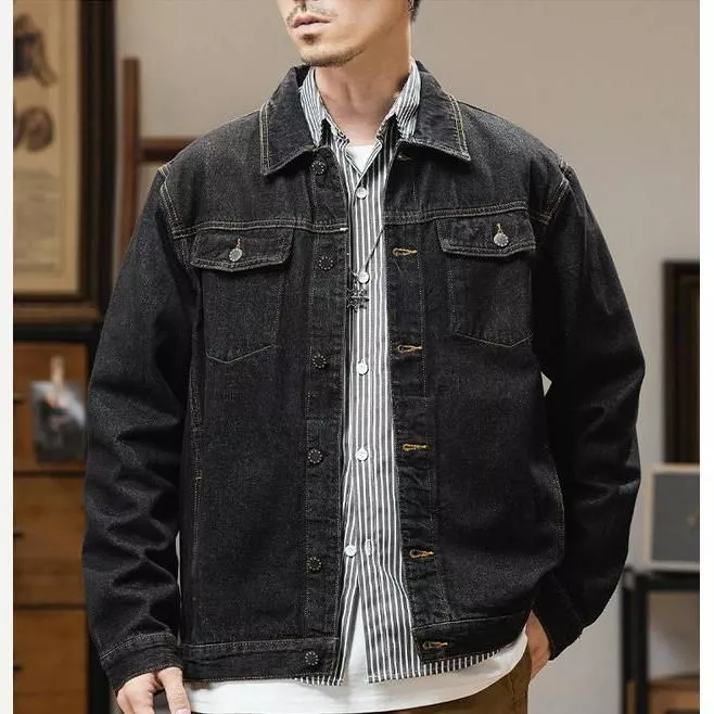 Men’s Oversized Black Denim Jacket – Casual Cotton Motorcycle Coat for Spring and Autumn
