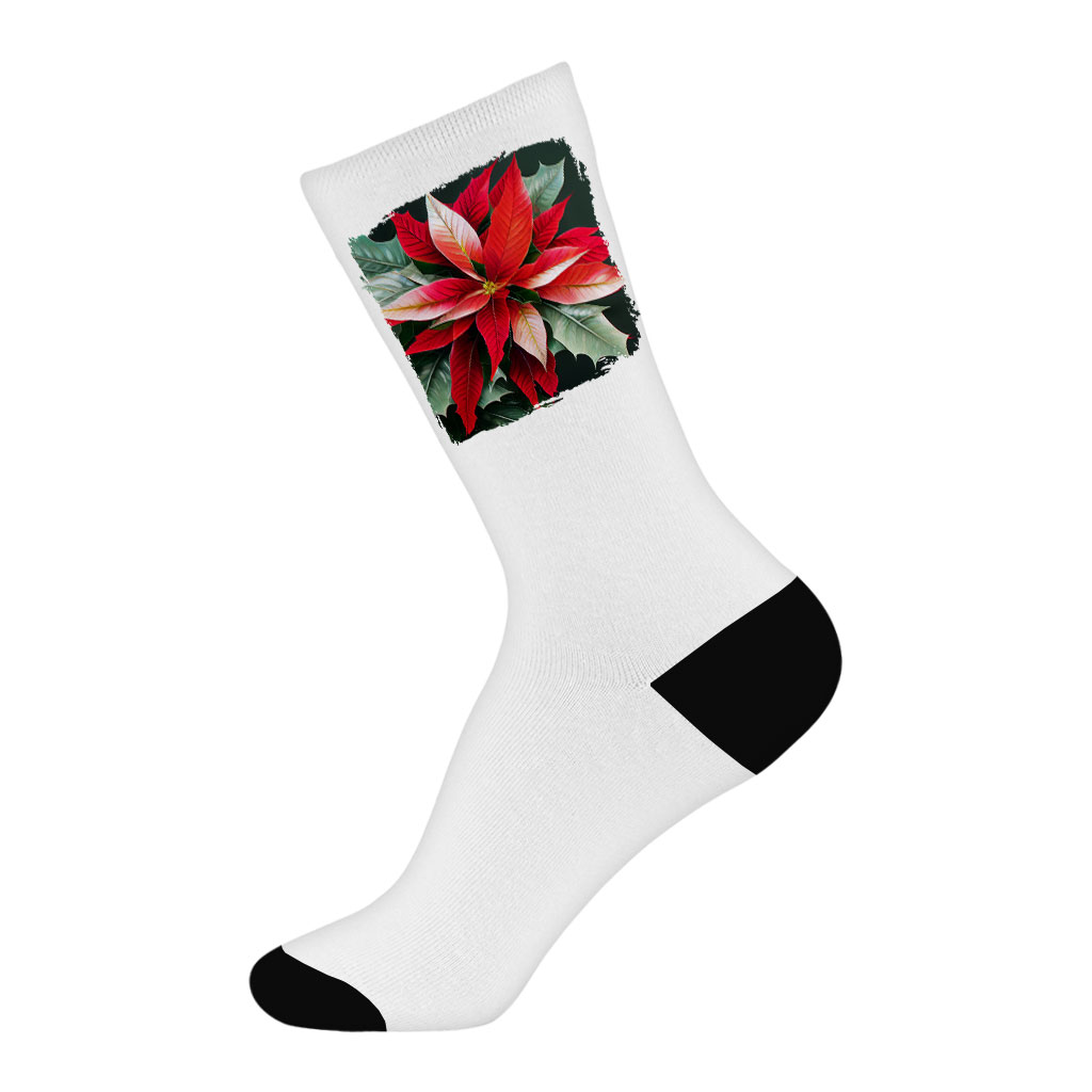 Fiber with strong elasticity, breathable and comfortable, these socks are ideal for indoor and outdoor activity. Polyester and cotton. Poinsettia Socks is designed and printed in California.