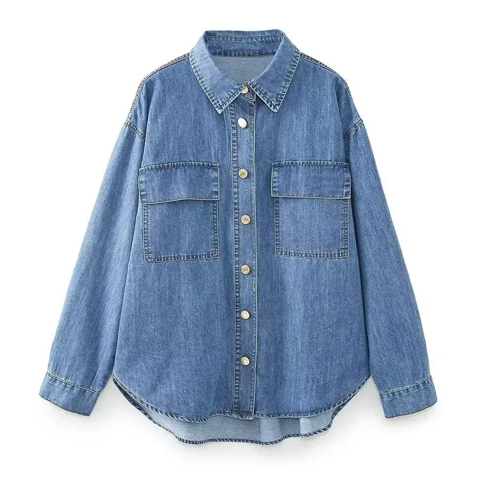 Our blouse is designed with practicality and poise in mind. The double front pockets not only serve a functional purpose but also add an element of casual flair, while the single-breasted closure ensures a snug and secure fit. The turn-down collar adds a touch of professionalism, making it ideal for business environments. Moreover, the non-stretch denim fabric maintains its shape throughout the day, ensuring you look as sharp in the evening as you did in the morning.