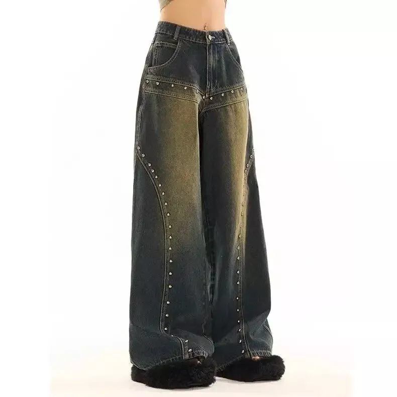 Each pair is a canvas of creativity, showcasing a washed and weathered look complemented by distinctive rivet decorations. The high-waisted cut not only enhances your figure but also offers unmatched comfort for day-long wear. Made from premium polyester with a hint of stretch, these jeans prioritize both style and flexibility. The full-length wide-leg design allows for versatile styling with your favorite footwear, from classic boots to chic sneakers.