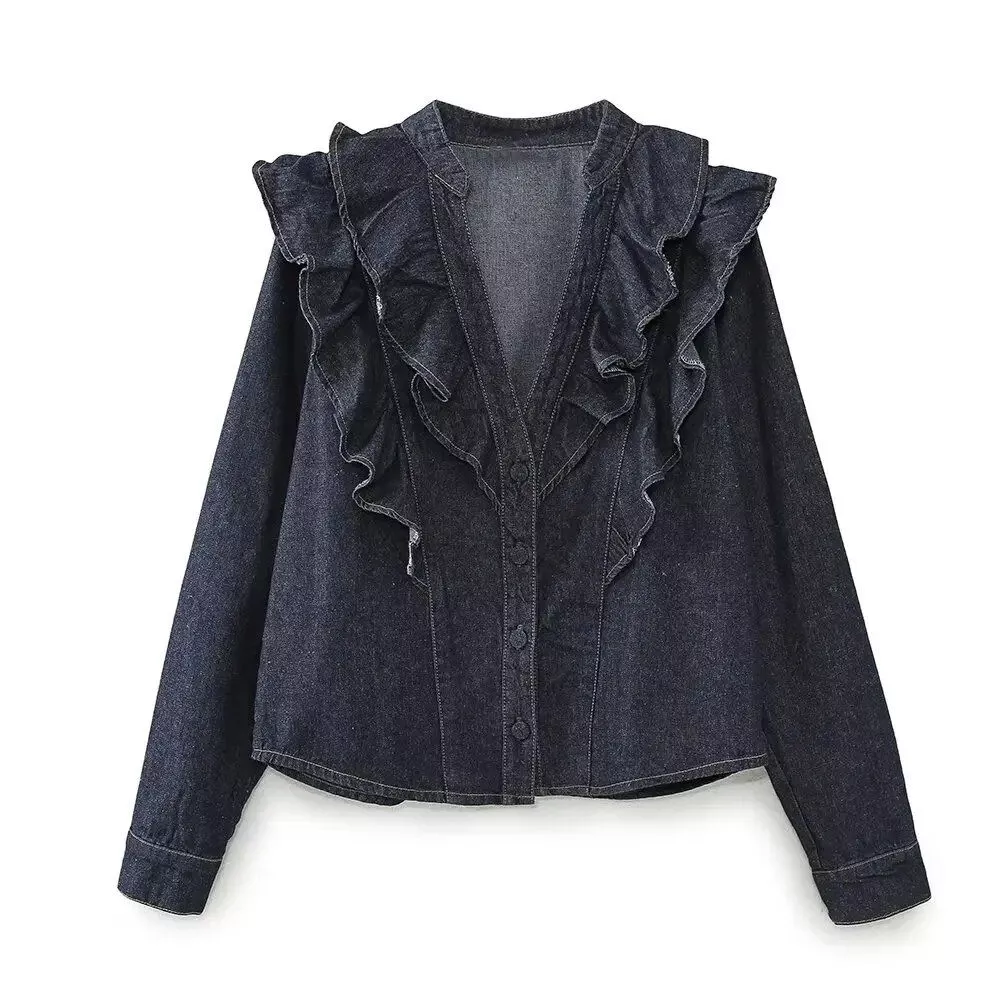 Step into a world where classic charm meets modern sophistication with our Vintage V-Neck Denim Ruffle Blouse. Designed for the fashion-forward woman who appreciates a blend of professional flair and timeless style, this blouse is a must-have addition to your wardrobe. Perfectly suited for spring and summer, its lightweight fabric and tailored fit ensure comfort without compromising on elegance. Whether it’s for that important business meeting or a casual lunch date, this blouse is your go-to for an effortlessly chic look.