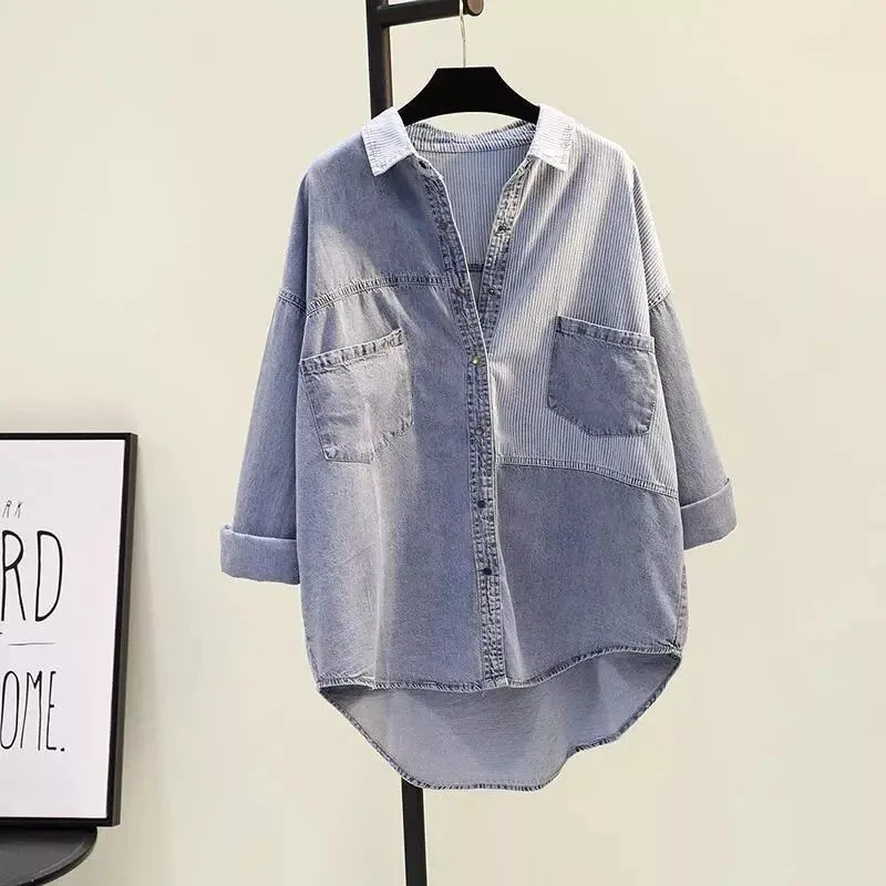 Introducing the must-have wardrobe staple that effortlessly blends classic charm with contemporary fashion – our Women’s Oversized Patchwork Denim Shirt. Designed for those who appreciate a relaxed yet chic aesthetic, this casual long-sleeved jean blouse is perfect for a variety of occasions, from a laid-back day out to a stylish evening gathering. With its easy-going vibe and versatile design, it’s a piece that promises to be your go-to favorite for seasons to come.