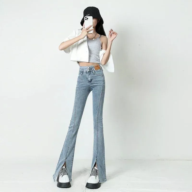 Our jeans boast a flattering low waist cut, a signature of the Y2K fashion era, paired with a trendsetting split hem that makes each step a showcase of style. The 103-106cm length ensures a perfect brush with your choice footwear, from chunky sneakers to strappy heels. Medium thickness fabric offers durability and a just-right feel, suitable for all-day wear. Office Lady style meets streetwear chic, with a pair of trousers that works as hard as you do, and then some.